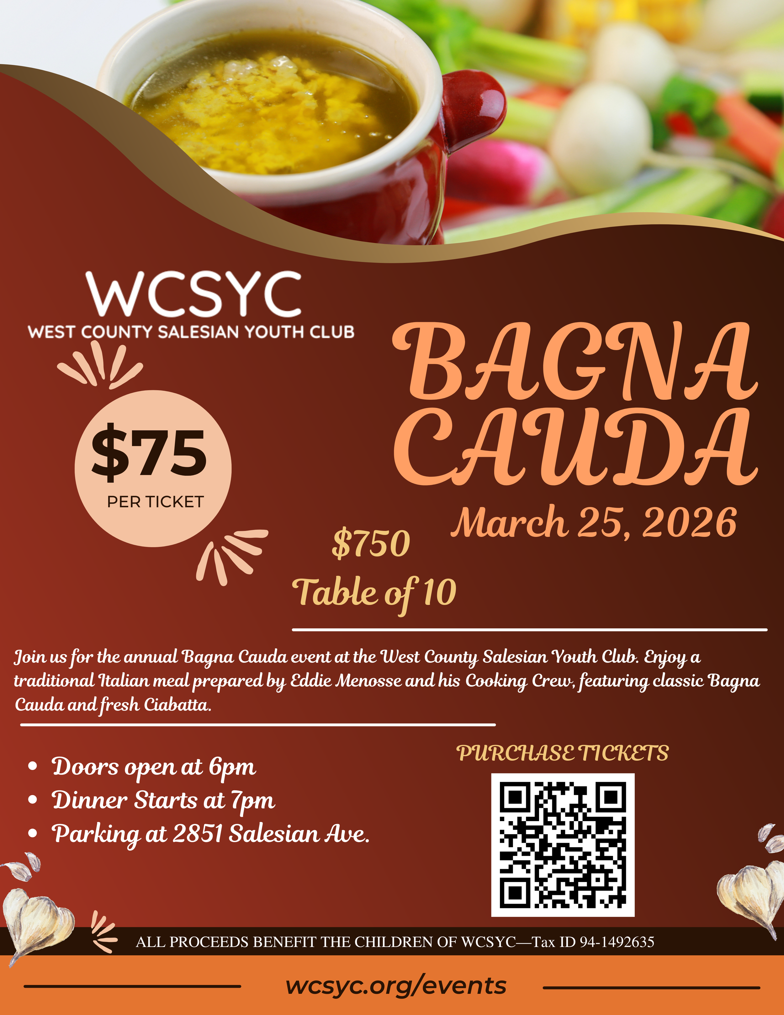 Back to All Events Bagna Cauda 2026 Wednesday, March 25, 2026 5:30 PM 9:00 PM Google Calendar ICS PURCHASE TICKETS