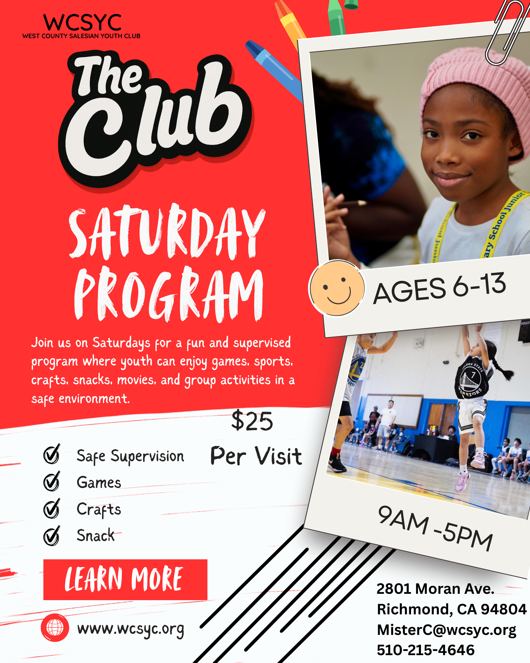 Our Saturday Program provides youth with a safe, supervised, and welcoming space to spend their day enjoying games, recreation, crafts, movies, snacks, and group activities. It is designed to give families a dependable weekend option while creating a fun environment where young people can stay active, engaged, and connected.